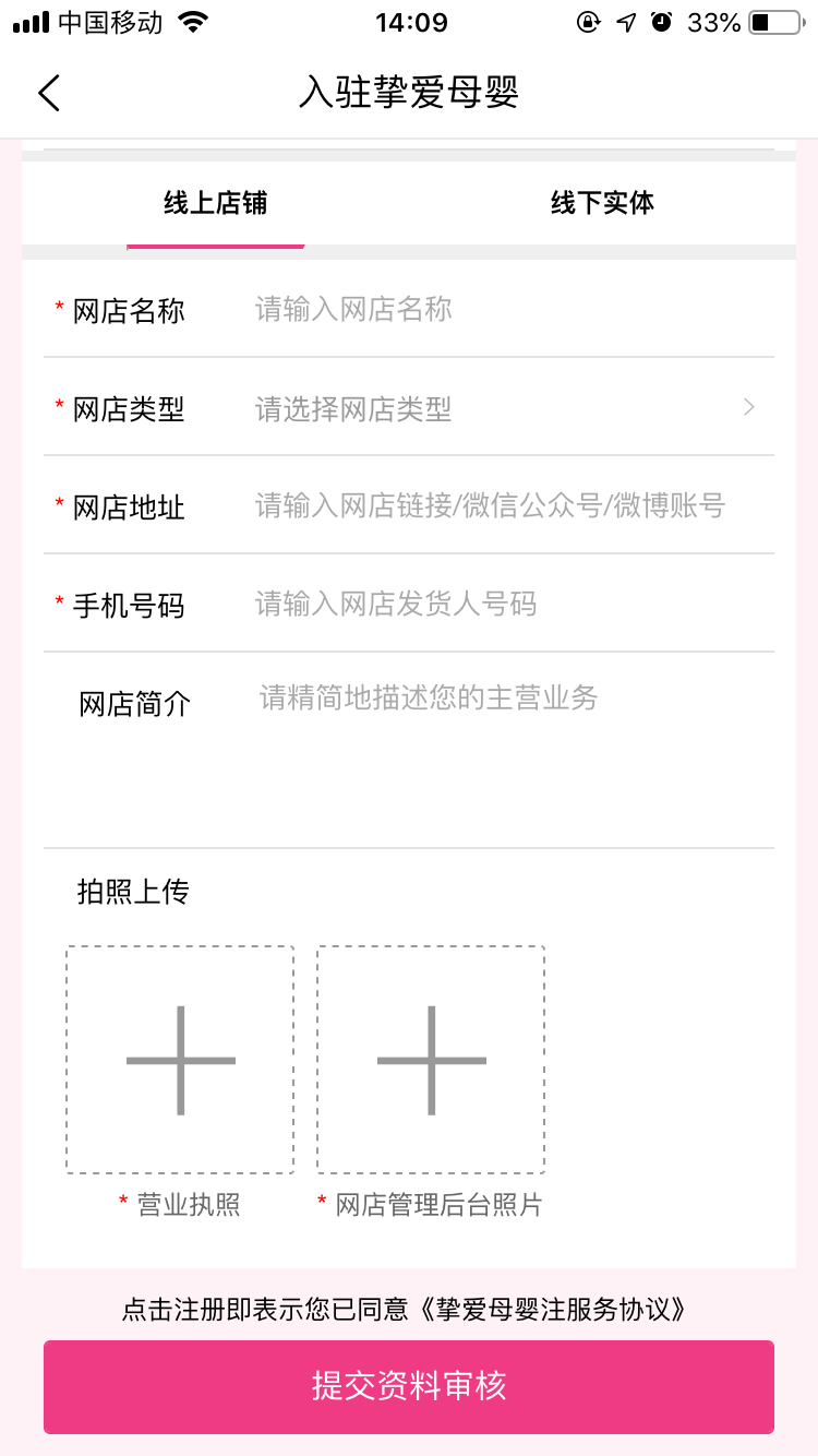 3.注册时需要使用一个没有在挚爱平台注册过的手机号与基础信息,填写店铺时如果是企业客户或实体店客户需要准备营业执照,店铺门头照片等先关信息,如果是网店需要保存网店后台图片信息